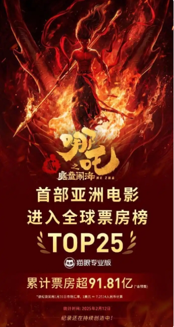 目前 影片《哪吒之魔童闹海》 总票房91.82亿 进入全球影史票房榜前25名 成为首部进入全球票房榜前25亚洲电影